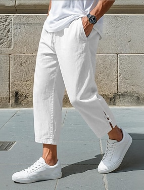 Herr Linne Byxor Långbyxor Sommarbyxor Säckiga byxor Beskurna byxor Snörning Elastisk midja Ensfärgat Slät Komfort Andningsfunktion Ankellång Ledigt Dagligen Helgdag Semester Mode Svart Vit Oelastisk