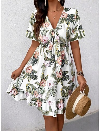 Dam Mini klänning Boho-klänning Vintage klänning Vardagsklänning Elegant Mode Modern Utomhus Semester Utekväll Normal Blommig Kortärmad V-hals Vit Grön Ljusblå Sommar Vår