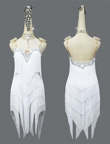 Damklänning för latinamerikansk dans med vita fransar, strass, spaghettiband, rygglös, salsa, cha cha, rumba, samba, tävlingsdräkt