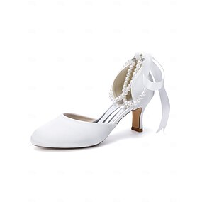 Lågklackade brudskor i satin för kvinnor – eleganta champagnefärgade pumps med pärlrosett för äldre brudar på bröllop i staden