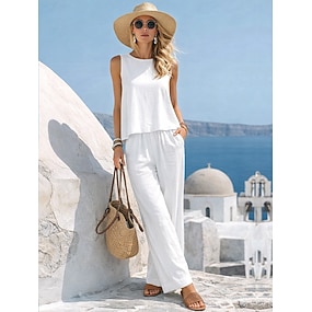 Dam Set med bomullslinne Linneväst i bomull Byxuppsättningar Ärmlös Rund hals Ensfärgat Mode Streetwear Ledigt Dagligen Utomhus Vit Gul Beige Sommar Normal