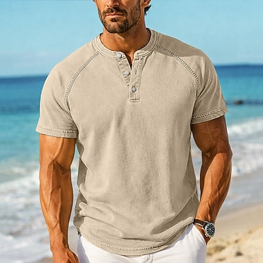 Herr T-shirt Henleytröja Tvätta skjorta i 100 % bomull T-tröja Kortärmad Henley Höst vinter Sommar Vår Ensfärgat Slät Vintage Streetwear Ledigt Färgade plagg Urblekt Tvättad Ledigt Hem Gata Ljusbl