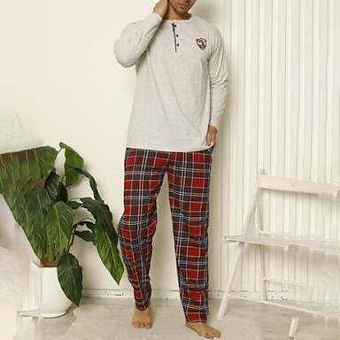 Herr Vardagsklädsel Sovkläder Pyjamas set Pyjamastopp och byxa 2 delar Rutig Stylish Ledigt Komfort Hem Dagligen Bomullsblandning Komfort Henley Långärmad T-shirt Byxa Snörning Elastisk midja Sommar