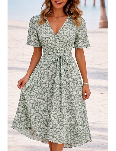 Dam Midiklänning Boho-klänning Solklänning Vardagsklänning Elegant bohemliv Semester Strand Helgdag Datum Normal Blommig Grafisk Kortärmad V-hals Blå Rodnande Rosa Grön Sommar Vår