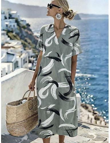 Dam Midiklänning Solklänning Vardagsklänning Semester Ledigt Strandstil Strand Fest Lös passning Grafisk Geometrisk Kortärmad V-hals Grön Sommar Vår