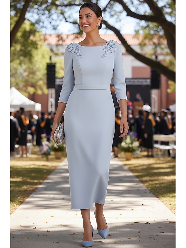 Åtsmitande Ankellång Festklänning Cocktail klänning Bröllopsgästklänning Klänning till brudens mor 3/4 ärm Rund hals Elegant Formell Stretch crepe med Applikationsbroderi Enfärgat