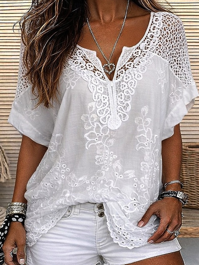 Dam Blus Spets Ensfärgat Stylish Ledigt Kortärmad V-hals Vanliga toppar Dagligen Blå Svart Vit Orange Grå Sommar Vår Höst #11831016
