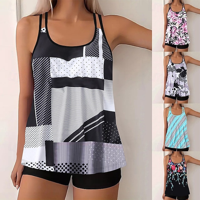Dam Badkläder 2 st Shorts Baddräkt Öppen rygg Semester Standkläder Blommig U-hals Ärmlös Baddräkter #12121037