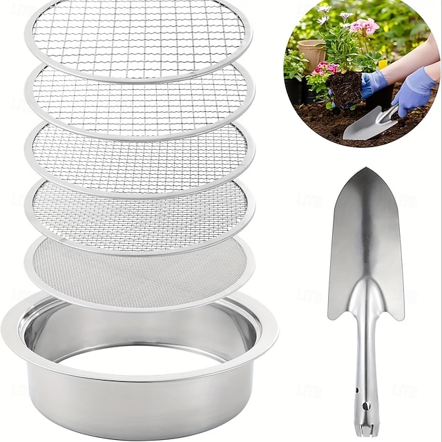Rostfritt stålsiktset för trädgårdsskötsel med 5 storlekar 1/3/6/9/12 mm utbytbara maskor inklusive spade, perfekt för trädgårdsskötsel &, jordsiktverktyg, avtagbar kompostskärm för jord, sand, stenar#13220782