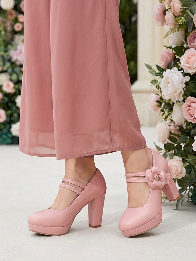 Rosa platåskor med Mary Jane-klack för kvinnor, grova klänningar med blockklack och blommiga detaljer för brudens mor, trädgårdsbröllop &formella evenemang #13970937