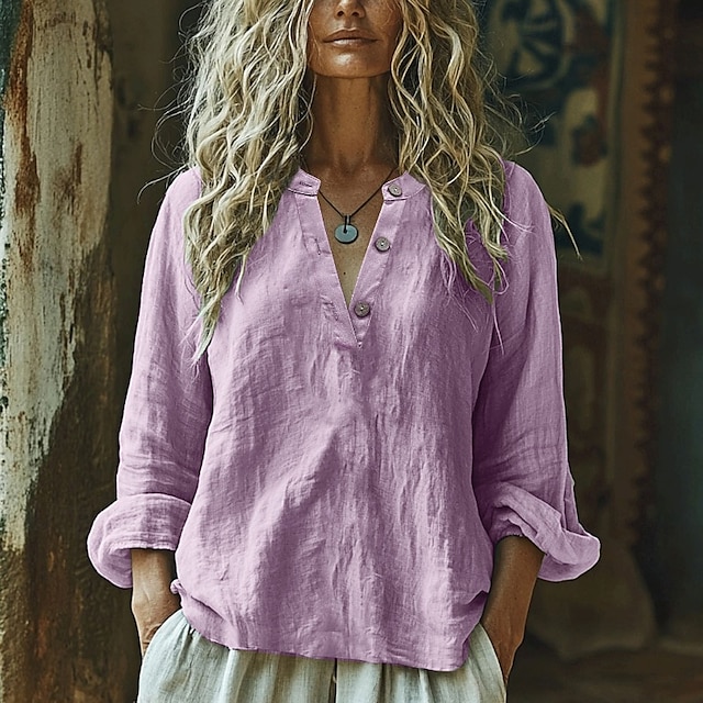 Dam Skjorta Texturblus Linneinspirerade skjortor Blus Knappar Slät Modern Ledigt Långärmad V-hals Vanliga toppar Helgdag Utekväll Vit Ljuslila Kaki Ljusblå Höst #14282346