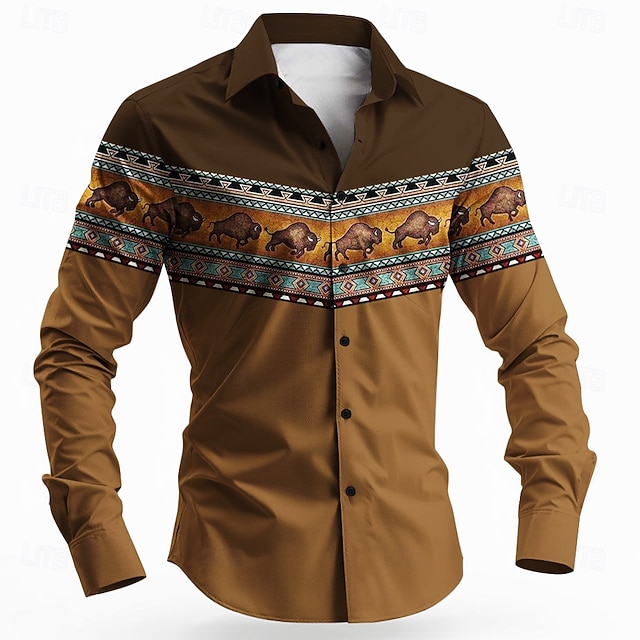Herr Tjur Etnisk Indisk kultur Skjorta Knapp upp skjorta Långärmad Vintage retro Stam Utomhus Camping och vandring Jakt Vår Höst Nedvikt 3D-utskrift krage skjortor Blå Brun Kaki #14373688