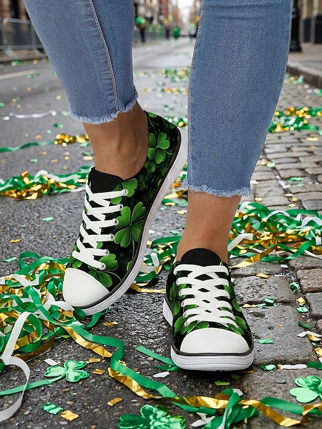 Låga sneakers i canvas med grönt klövertryck för dam, St. Patrick's Day - klassiska snörskor för vardagsbruk, irländsk parad, julfest och gatufestival &vardagskläder #15576560