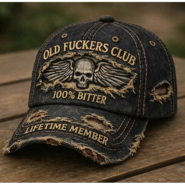 Rolig retro gamlingklubb broderad casualhatt, vintage sliten dödskalle med vingar pappa basebollkeps justerbar rolig grafisk hatt för män utomhus streetwear#16180840