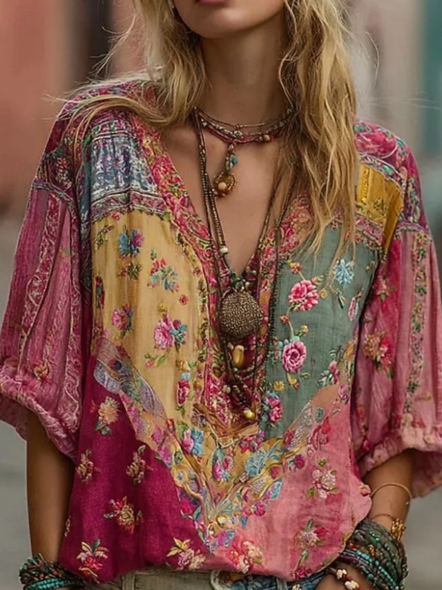 Dam Skjorta Linneskjortor i bomull Boho skjorta Blus Lappverk Mönster Blommig Grafisk bohemliv Stylish Etnisk Halvlång ärm V-hals Vanliga toppar Dagligen Helgdag Utekväll Rubinrött Sommar Vår #16900429