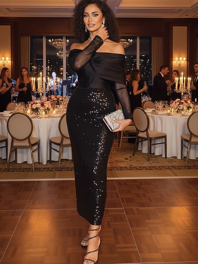 Åtsmitande Ankellång Cocktailklänningar Festklänningar Elegant glittrande Långärmad Rund hals Bröllop Formell Paljetter med Glitter