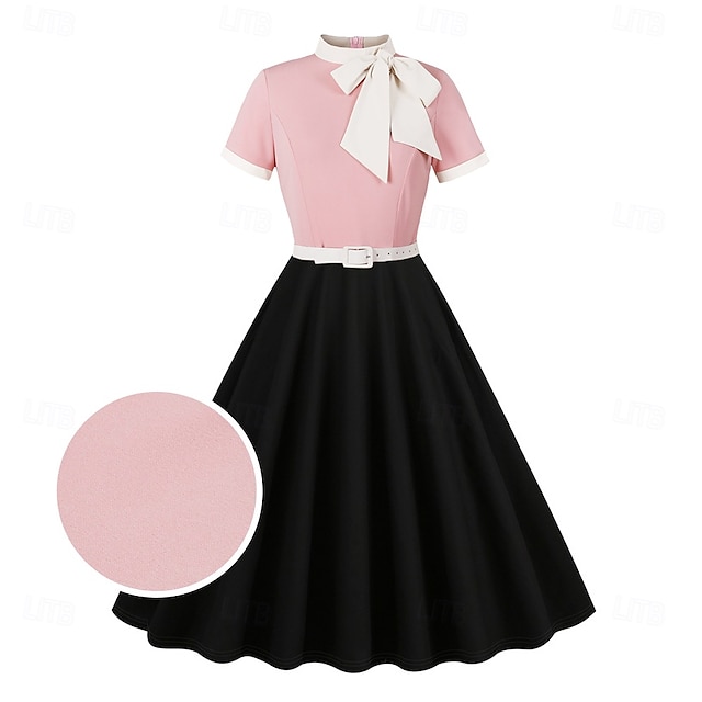 [Tyg] Tillverkad av högkvalitativ polyester, erbjuder denna klänning en lyxig och bekväm känsla. Tyget säkerställer en mjuk drapering som kompletterar den övergripande designen, vilket gör den idealisk för långvarig användning. [Passform] Designad med en smickrande passform och flare-silhuett, förbättrar denna klänning en timglasfigur. Den smugna midjan tack vare ett klassiskt vitt bälte framhäver bärarens kurvor, medan A-linje kjolen lägger till en element av elegans och grace. [Designhöjdpunkter] Klänningen har en sofistikerad retroinspirerad design med en rund halsringning prydd med en stilig vit fluga. De korta ärmarna är detaljerade med vita kanter, vilket ger en vintage charm till den övergripande looken. Den rika svarta A-linje kjolen ger en vacker kontrast till den mjuka rosa toppen, vilket erbjuder en harmonisk blandning av stil och elegans. [Tillfällen] Perfekt för en mängd olika evenemang, kan denna mångsidiga klänning bäras vid maskerader, cocktailpartyn, festivaler och möhippor. Det är ett utmärkt val för dem som vill göra ett stiligt uttalande vid formella eller avslappnade sammankomster. [Storleksområde] Finns i storlekarna S, M, L, XL och XXL, vilket säkerställer en passande passform för en mängd olika kroppstyper, vilket gör den till ett inkluderande tillskott till alla garderober.
