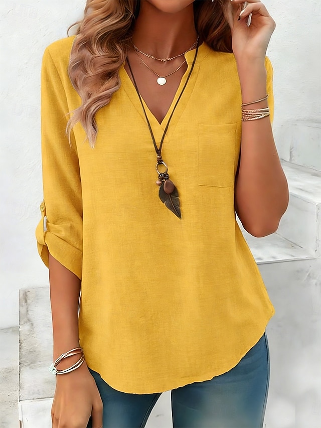 Dam Skjorta Linneskjortor i bomull Casual skjorta Blus Slät Stylish Klassisk Modern Långärmad V-hals Vanliga toppar Dagligen Helgdag Utekväll Blå Gul Purpur Grön Kaki Vår Höst #19394703