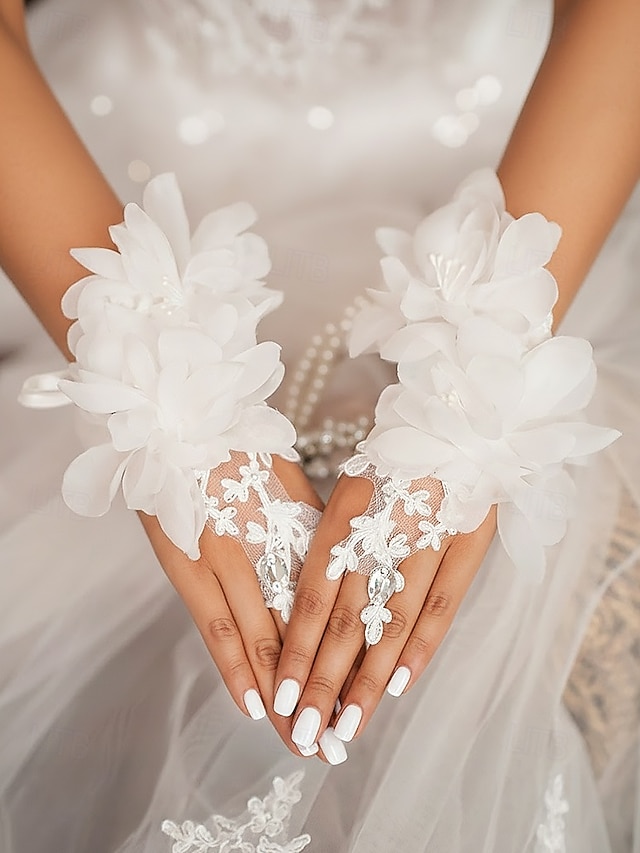 brudhandskar för kvinnor, polyestermaterial, flerfärgade, kronbladsblommönster med strassdetaljer, eleganta spetshandskar perfekta för bröllop, fester och speciella evenemang#15730133