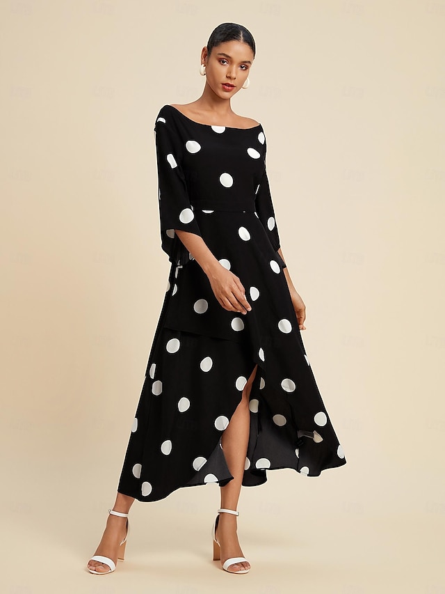 Dam Elegant klänning Midiklänning Svart 3/4 ärm Prickigt Asymetrisk fåll Utanför axeln Vår & sommar Över axeln Elegant Romantisk S M L