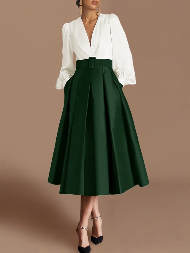 A-linje Telång Cocktailklänningar Festklänningar Elegant Färgblock Silkig Långärmad V-hals Formell Bröllopsgäst Satäng med Veckad #16781274
