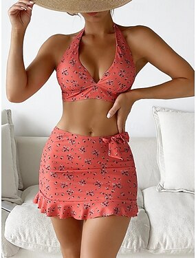 Kvinnors bikini 3-delad baddräkt med kjol kjol slimmad rygglös semester strandkläder blommig halterneck ärmlösa baddräkter