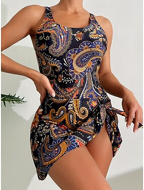 Kvinnors enbitarbikini med kjol Boho monokini hög skärning mage kontroll hög midja slim rygglös semester vintage grafisk paisley U-hals ärmlös baddräkter