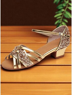Damskor med guldglitter i latinstil, låg blockklack, fotledsrem och öppen tå – professionella ballroomskor för tävlingar och träning