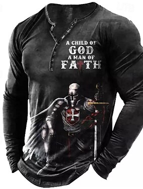 Herrars Lång ärm Henley T-Shirt Ett Guds barn En troende man Korsfarar riddare Grafisk Tee