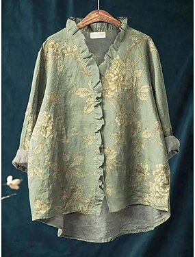 Kvinnors Skjorta Linne Likt Andningsbar Lättvikts Knapplåda Tunika Skjorta Krage Lång Ärm Blommig Grafisk Daglig Stilig Retro Vintage 3/4 Längd Ärmar Daglig Semester Ljusblå Vår