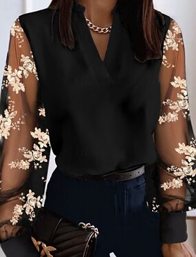 Dam Skjorta Elegant Satin topp Blus Spets Lappverk Färgblock Slät Ledigt Långärmad V-hals Vanliga toppar Dagligen Helgdag Utekväll Blå Svart Vit Mörkgrå Höst Vinter