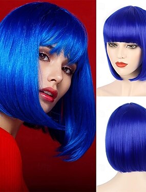 Karnevalsperuk 2026 Blå Rak Bob Korta Syntetisk festivalperuk Mardi Gras Parad Cosplay-dräkthår för Dam