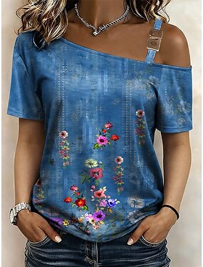 Dam T-shirt T-tröja Mönster Blommig Grafisk Stylish Klassisk Ledigt Kortärmad Asymmetrisk hals Vanliga toppar Dagligen Utekväll Helgen Blå Sommar Vår