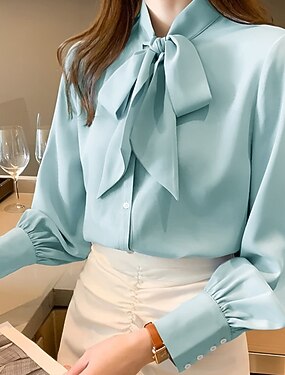 Dam Skjorta Elegant Satin topp Blus Knappar Rosett Slät Aktiv Stylish Långärmad Rund hals Vanliga toppar Dagligen Helgdag Utekväll Blå Sommar Vår