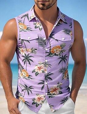 Herr Kokosnötsträd Blomtryck Blommor Skjorta Hawaii skjorta Aloha skjorta Ärmlös Tillflykt Strandsemester Sommar Vår Nedvikt 3D-utskrift Främre två fickor Skjortor med knappar Gul Rodnande Rosa
