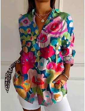 Dam Skjorta Button Down skjorta Blus Knappar Blommig Stylish Klassisk Modern Långärmad Tröjkrage Vanliga toppar Dagligen Helgdag Utekväll Vit Rodnande Rosa Grön Ros rosa Sommar Vår
