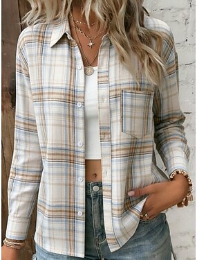 Dam Skjorta Blus Lappverk Knappar Mönster Grafisk Geometrisk Rutig Vintage Tropisk Dagligen Långärmad Tröjkrage Vanliga toppar Dagligen Brun Sommar Vår