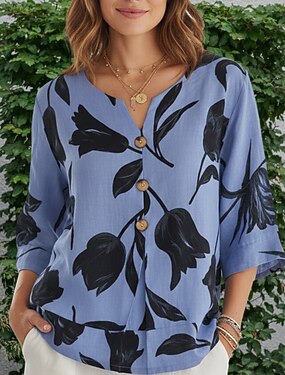Dam Blus Konstbomullslinne Knappar Mönster Blommig Vintage Stylish Ledigt 3/4 ärm V-hals Vanliga toppar Dagligen Helgdag Utekväll Vit Vin Rubinrött Grön Violett Sommar Vår