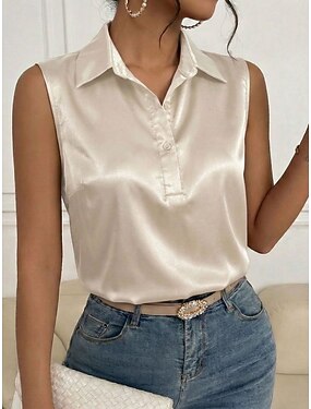 Dam Blus Knappar Ensfärgat Stylish Grundläggande Ledigt Ärmlös Tröjkrage Vanliga toppar Dagligen Kontor Arbete Vin Marinblå Grön Kaki Aprikos Sommar Vår