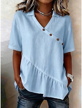 Dam Summer Tops Blus Lappverk Knappar Slät Stylish Klassisk Modern Kortärmad V-hals Vanliga toppar Dagligen Helgdag Utekväll Svart Vit Brun Kaki Aprikos Sommar Vår