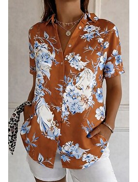 Dam Skjorta Button Down skjorta Casual skjorta Summer Tops Knappar Mönster Blommig Grafisk Vintage Stylish Modern Kortärmad Tröjkrage Långa toppar Dagligen Svart Kaki Sommar Vår Höst