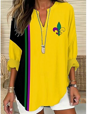 Mardi Gras kvinnors blus i linneliknande andningsbart lättviktigt grafisk vintage daglig stilfull lång ärm V-krage långa toppar daglig semester tryck vit ljuslila lila sommar vår