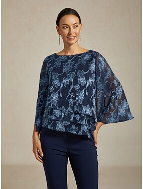 Dam Blus Chiffong toppar Spets Blommig Elegant Stylish Ledigt Rund hals Vanliga toppar Bröllopsgäst Date Night Outfits Cocktailklädsel Marinblå Vår Höst Vinter
