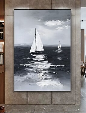 handgjord svartvit oljemålning på duk, segelbåt, väggkonst, marinlandskap med 3D-textur, kanvaskonst, segelbåtsmålning