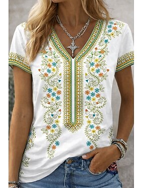 Dam T-shirt Mönster Blommig Grafisk bohemliv Vintage Ledigt Kortärmad V-hals Vanliga toppar Dagligen Gul Rubinrött Purpur Grön Sommar Vår