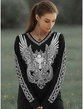 Kvinnors Boho VIKING T-shirt Grafik Vintage Stilig Klassisk Långärmad V-ringad Vanliga toppar Daglig Helgtryck Svart Sommar Vår