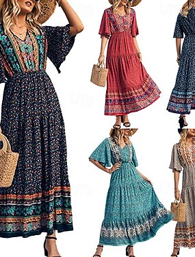 Dam Maxiklänning A linjeklänning Ledigt Utomhus Utekväll Normal Blommig Kortärmad V-hals Blå Marin Svart Gul Sommar Vår