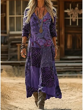 Dam Maxiklänning Boho-klänning Vintage klänning Vardagsklänning Vintage Dagligen Utomhus Semester Lös passning Blommig Långärmad V-hals Purpur Vår Höst