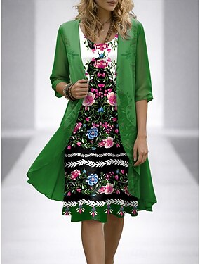 Dam Klänning Set A linjeklänning Elegant Semester Blommig Grafisk Multi lager Mönster Midiklänning 3/4 ärm Rund hals Dagligen Rodnande Rosa Rubinrött Sommar Vår Normal