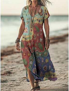Dam Maxiklänning Boho-klänning Vardagsklänning A linjeklänning Klänning med tryck Vintage Utomhus Strand Semester Normal Blommig Grafisk Kortärmad V-hals Grön Sommar Vår